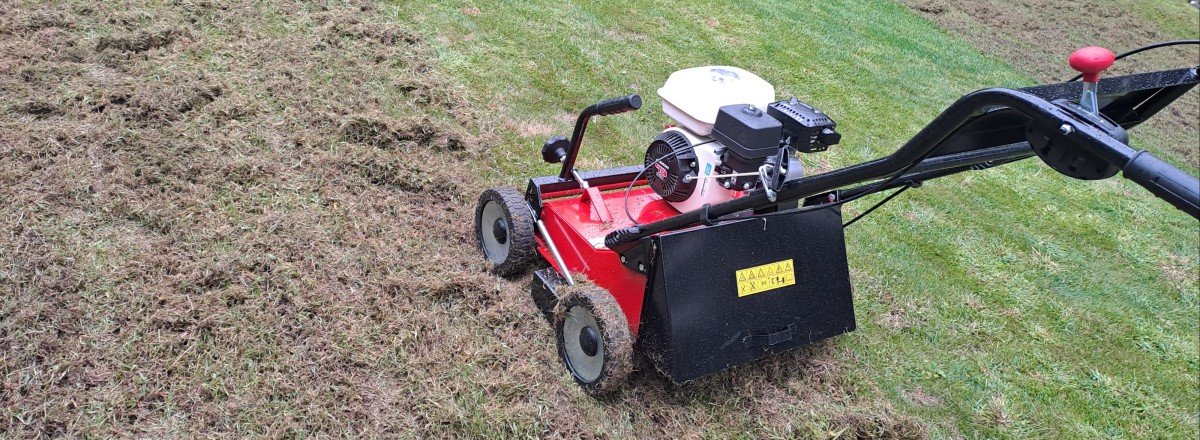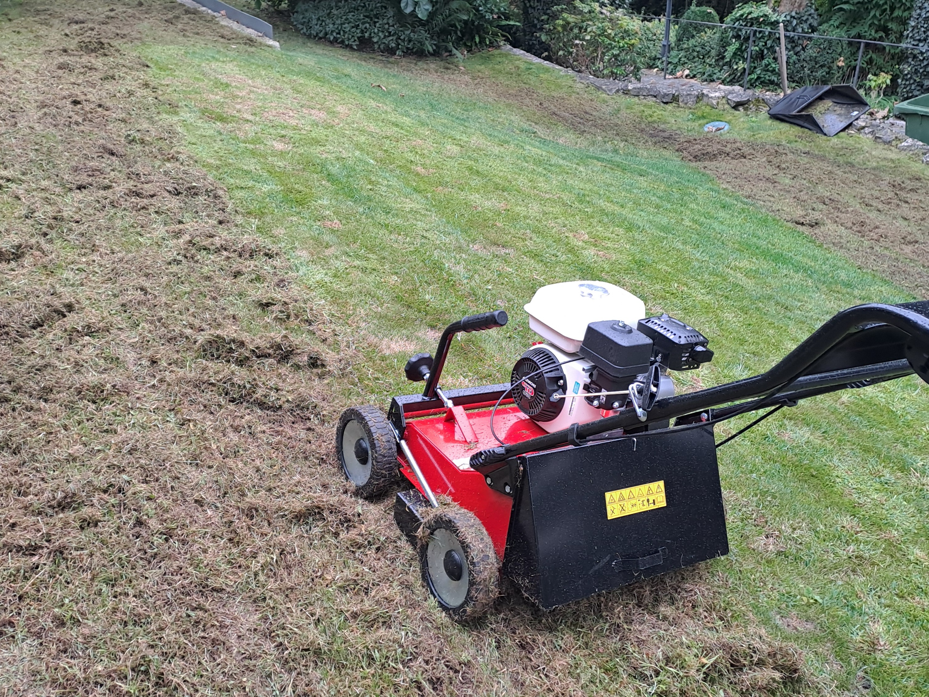 - Vertikutierer leicht einstellen, um den Boden nicht zu tief zu verletzen